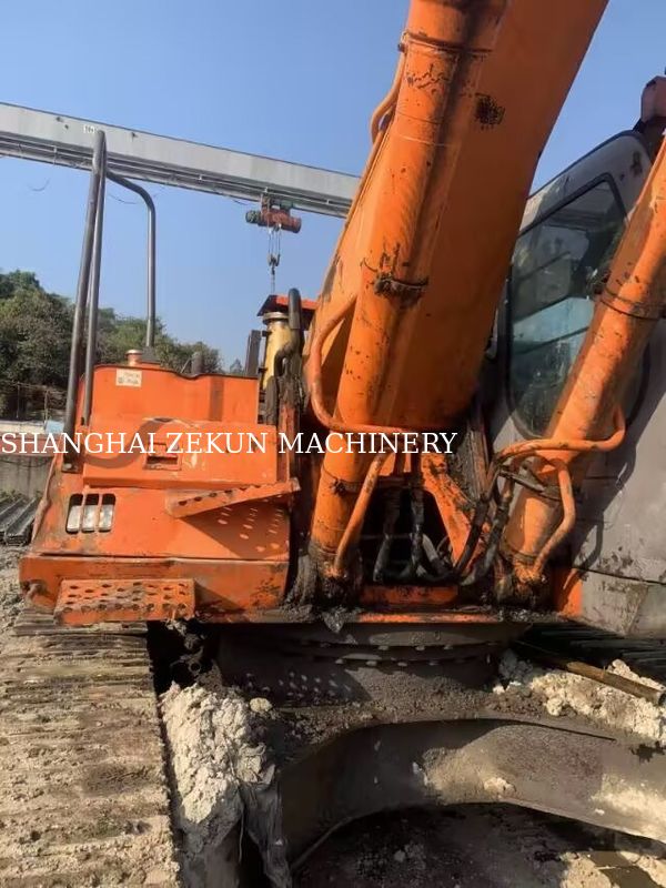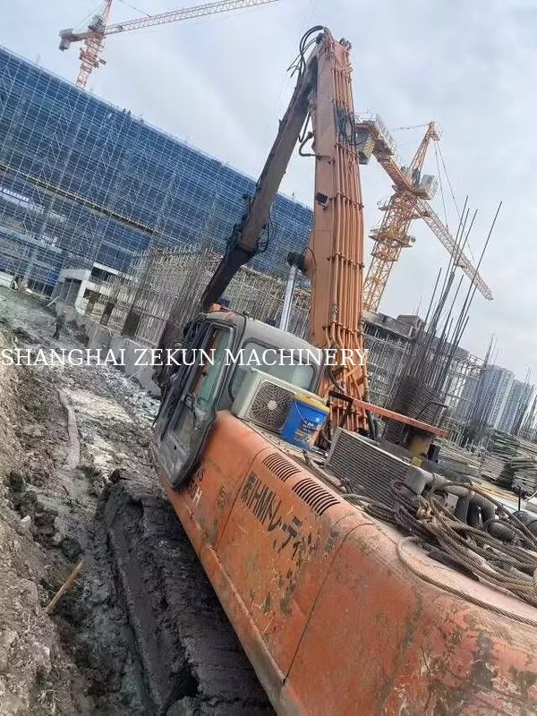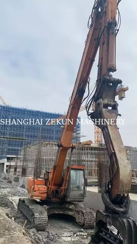 This Hitachi ZX350 excavator has been specially configured for long-reach applications, featuring an 18-meter extended boom and a sheet pile breaker attachment, making it ideal for demanding projects such as river dredging, slope stabilization, and deep foundation work.